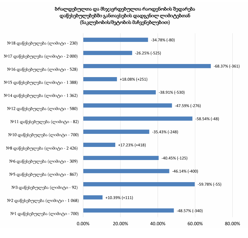 2025 წლის 31 აგვისტოს მონაცემებით, დაწესებულებებში განთავსებულ ბრალდებულთა და მსჯავრდებულთა საერთო რაოდენობა (10 124) დადგენილ ლიმიტზე 2 208 ერთეულით (17.9%) ნაკლებია, მაგრამ ამ მხრივ, განსხვავებული მდგომარეობაა სხვადასხვა დაწესებულებებში: