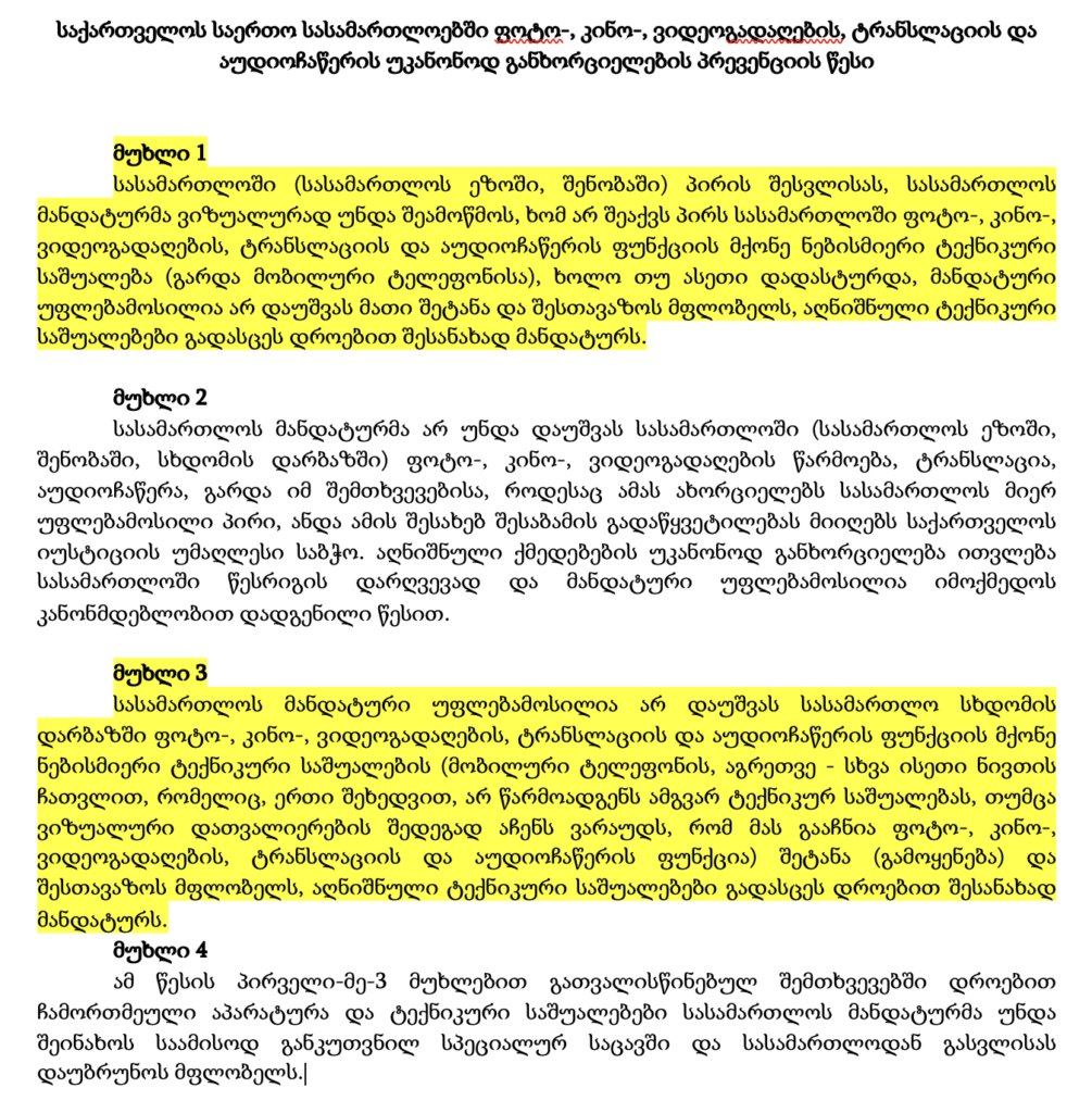 საუბარია იუსტიციის უმაღლესი საბჭოს 17 ივლისის დადგენილებაზე, რის საფუძველზეც საბჭომ საერთო სასამართლოებში ფოტო-, კინო-, ვიდეოგადაღების, ტრანსლაციის და აუდიოჩაწერის უკანონოდ განხორციელების პრევენციის წესი დაამტკიცა.