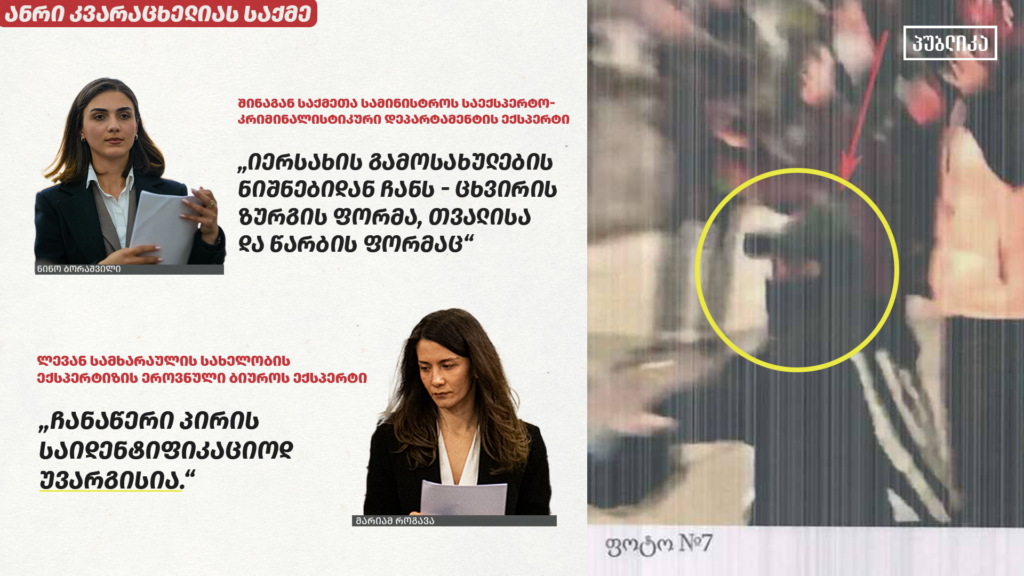 ბრალდების მხარის მიერ დანიშნული ექსპერტიზის დასკვნის ავტორმა, ნინო ბორაშვილმა ამ გამოსახულებაზე ცხვირის ზურგის, თვალის და წარბის ფორმა გაარჩია.