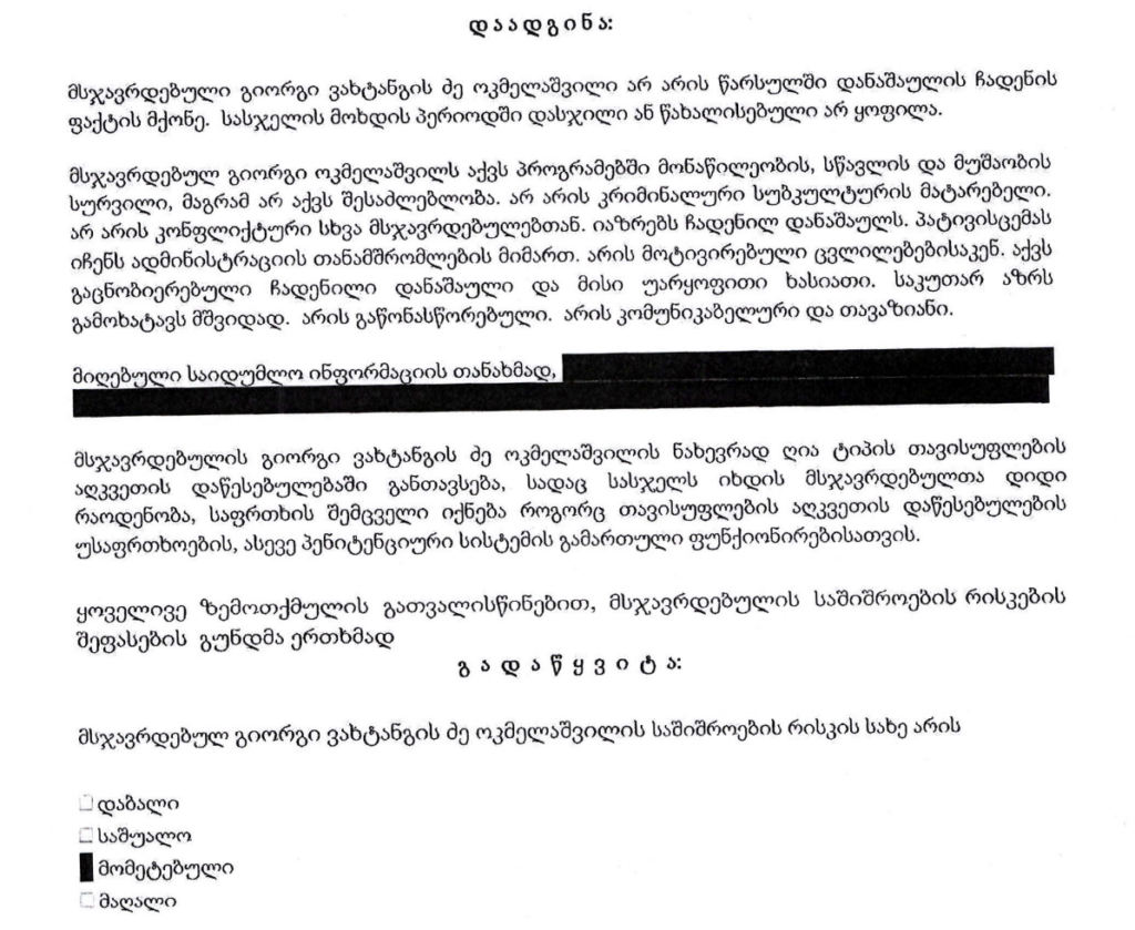 მსჯავრდებულის საშიშროების რისკების შეფასების გუნდის 14 მარტის საიდუმლო ინფორმაციის შემცველი სხდომის ოქმის ამონაწერიდან ირკვევა, რომ მსჯავრდებულ გიორგი ოკმელაშვილს აქვს პროგრამებში მონაწილეობის, სწავლის და მუშაობის სურვილი, მაგრამ არ აქვს შესაძლებლობა. არ არის კრიმინალური სუბკულტურის მატარებელი. არ არის კონფლიქტური სხვა მსჯავრდებულებთან. იაზრებს ჩადენილ დანაშაულს. პატივისცემას იჩენს ადმინისტრაციის თანამშრომლების მიმართ. არის მოტივირებული ცვლილებებისაკენ. საკუთარ აზრს გამოხატავს მშვიდად. არის გაწონასწორებული. არის კომუნიკაბელური და თავაზიანი.