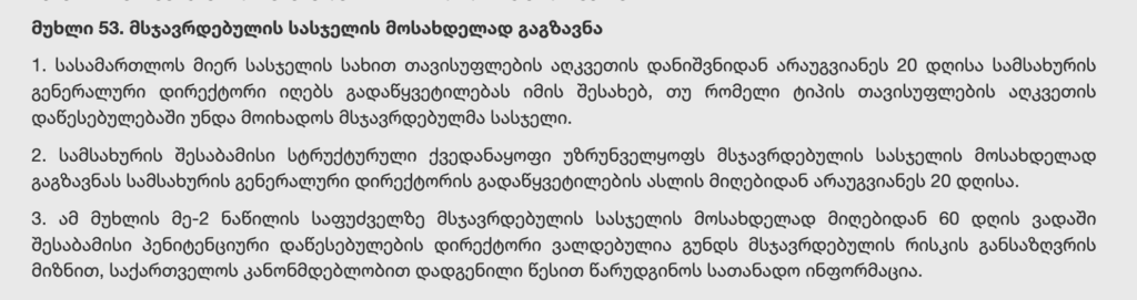 1 – მათი თქმით, პენიტენციური კოდექსის 53-ე მხულის პირველი ნაწილის შესაბამისად „სასამართლოს მიერ სასჯელის სახით თავისუფლების აღკვეთის დანიშვნიდან არაუგვიანეს 20 დღისა სამსახურის გენერალური დირექტორი იღებს გადაწყვეტილებას იმის შესახებ, თუ რომელი ტიპის თავისუფლების აღკვეთის დაწესებულებაში უნდა მოიხადოს მსჯავრდებულმა სასჯელი”.