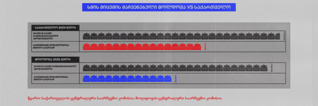 შედარებისთვის, საბოლოოდ 26 ოქტომბრის საპარლამენტო არჩევნებისთვის საქართველომ 67 უბანი გახსნა 42 ქვეყანაში, მოლდოვას კი იმავე წელს 37 ქვეყანაში 231 საარჩევნო უბანი ჰქონდა.