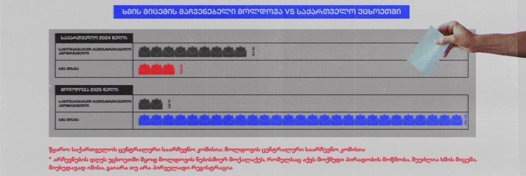თუმცა, საქართველოსგან განსხვავებით ბოლო წლების განმავლობაში მოლდოვამ საზღვარგარეთ დიასპორის ჩართულობას განსაკუთრებით შეუწყო ხელი. შედეგად 2024 წლის საპრეზიდენტო არჩევნებსა და რეფერენდუმში მონაწილეობა მიიღო მოლდოვის გარეთ მყოფმა 240 ათასზე მეტმა ადამიანმა, მეორე ტურში კი 328 ათასზე მეტმა ემიგრანტმა დააფიქსირა საკუთარი ხმა.