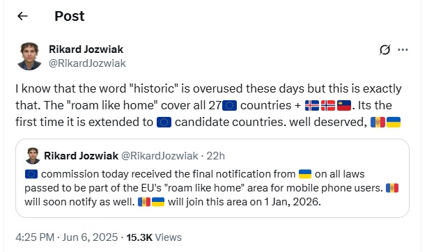 რიკარდ იოზვიაკის ინფორმაციით, „კომისიამ დღეს მიიღო უკრაინის საბოლოო შეტყობინება იმის შესახებ, რომ მიღებულია ყველა საჭირო კანონი, რათა ქვეყანა ევროკავშირის როუმინგის ზონის წევრი გახდეს. მოლდოვა ასევე მალე გააგზავნის იმავე შეტყობინებას. მოლდოვა და უკრაინა ამ ზონას 2026 წლის 1 იანვრიდან შეუერთდებიან”, – წერს ჟურნალისტი.