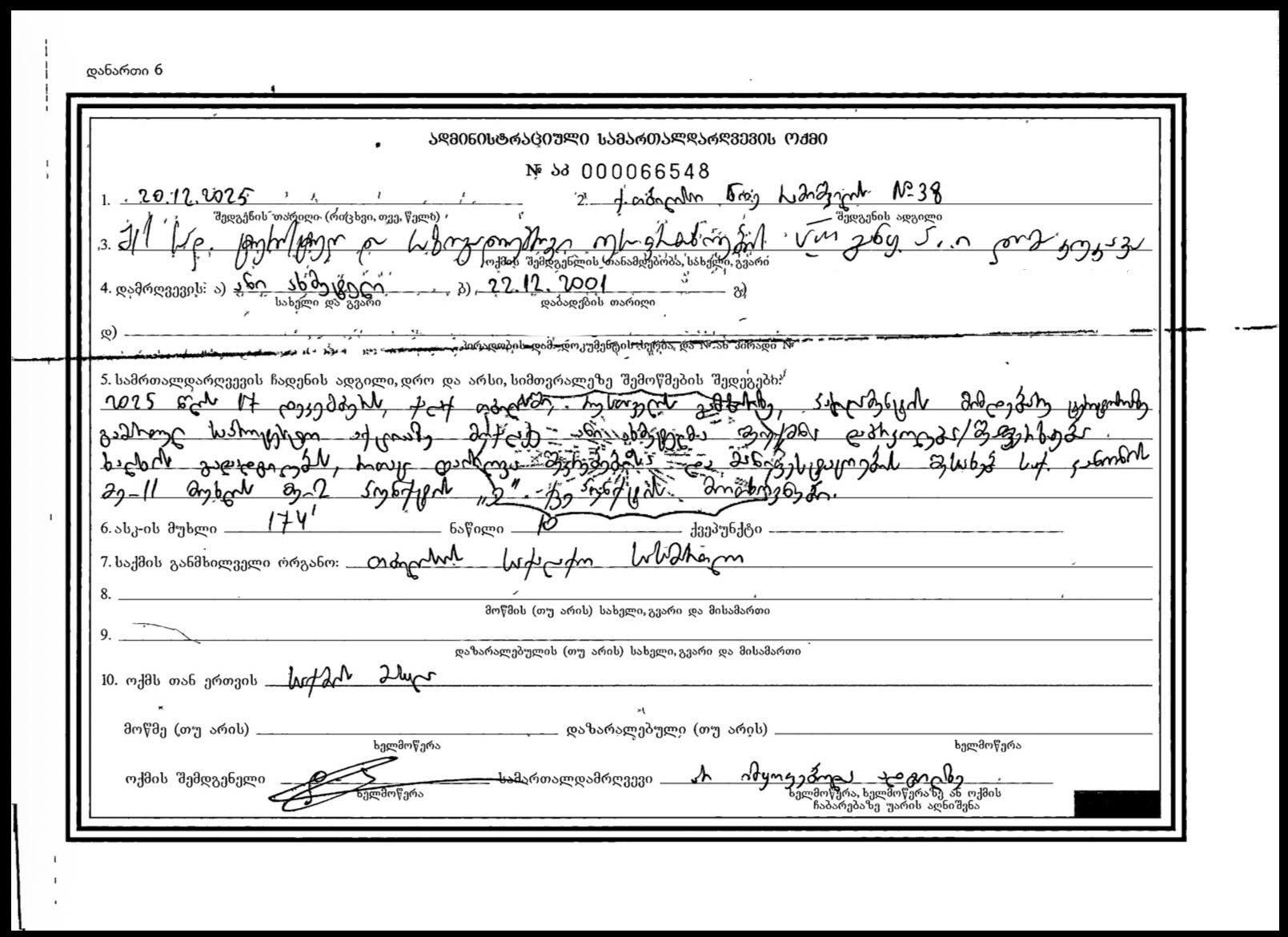 „და დაიწყო დაშინებისა და რეპრესიების ახალი ტალღა. დღეს დამირეკეს საქალაქო სასამართლოდან და მედავებიან ადმინისტრაციულ სამართალდარღვევათა კოდექსის 174-ე პრიმა მუხლის მე-10 ნაწილის დარღვევას, 2025 წლის 17 დეკემბერს, პარლამენტის მიმდებარე ტერიტორიაზე გამართულ საპროტესტო აქციაზე ტროტუარზე დგომით შემიქმნია დაბრკოლება/შეფერხება ხალხისთვის, რითაც დაირღვა შეკრებებისა და მანიფესტაციების შესახებ საქართველოს კანონის მე-11 მუხლის მე-2 პუნქტის ე) ქვეპუნტის მოთხოვნები.