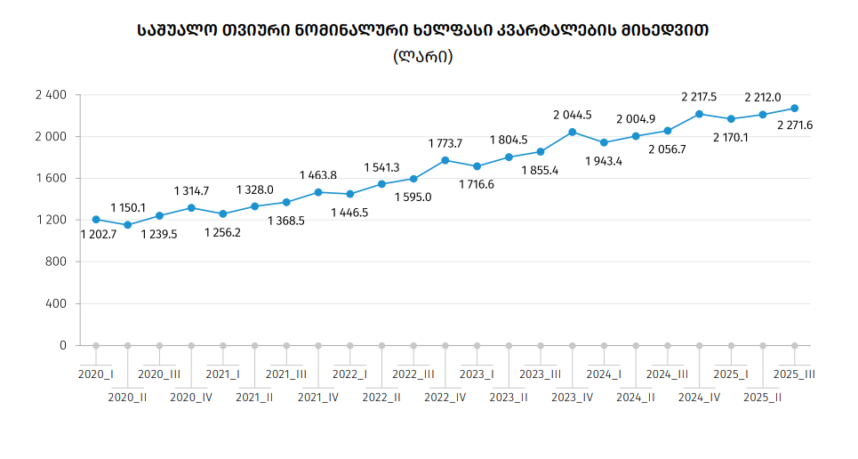საქსტატი: 2025 წლის III კვარტალში საშუალო თვიური ხელფასი გაიზარდა და 2 271.6 ლარი გახდა